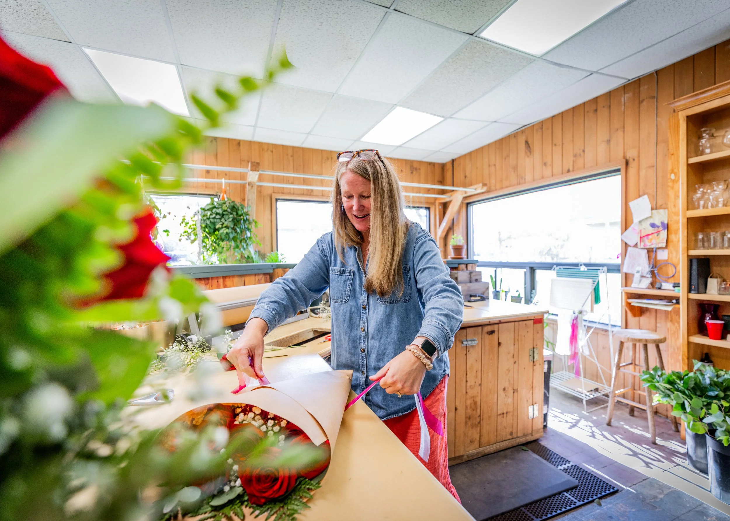 You can browse premade arrangements or work with Kelly at our flower bar to create a custom bouquet, corsage, boutonniere, or arrangement.